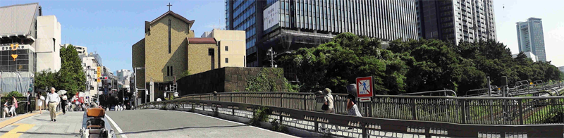 早稲田通りをそのまま教会を右手に見てゆるい坂を上がってゆくと、内堀通りに突き当たります。右手に靖国神社があり、内堀通りを越えて更に進むと皇居北の丸公園の田安門、そして武道館へと至ります。また教会を左手に見て、市ヶ谷駅方向には外濠に沿って緑豊かな土手公園が続きます。