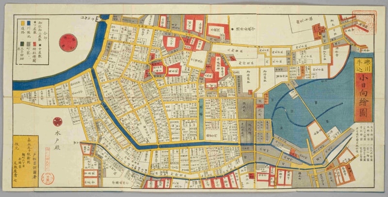 また周辺には楓が植えられ秋の紅葉時にはとても見事であったそうで、別名「楓の御門」とも呼ばれていましたが、明治35年(1902年)に撤去され、現在は、わずかに石垣の一部が道路の両側に対の形で残されているだけとなりました。小日向絵図を見ると現在の神楽坂辺りも武家屋敷が多かった様です。牛込門の下には落し口(小さな滝)がありましたが、そこまでは東から舟が入ることができました。