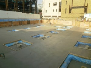 教会堂の基礎は25m以上の深さにある東京礫層を支持層とし、基礎工法には液状化の危険が低いとされているプレボーリング拡大根固め工法を採用しています。2012年8月16日に着工されましたが、地中より旧警察病院以前と想定される予期せぬコンクリート構築物が発見され、その撤去工事に1カ月を要しました。左の写真は教会堂を支えるため地中深く打ち込まれた基礎杭です。
