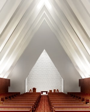 新しい教会堂の中心である大礼拝堂は最も広い床面積と広大な空間が割り当てられ、後方には親子礼拝室があります。説教壇、聖餐卓、洗礼盤のある講壇の後ろは美しいインド砂岩の壁で上部からの自然の光が入り、天井は祈る手が幾重にも重なった様な形状で広い明かり取りの窓から自然の光が会堂内を照らします。礼拝堂の床は厚み15mmのナラ無垢材を採用しました。現在使用しているドイツ・ボッシュ社製のパイプオルガンを分解し新礼拝堂の3階に移設しました。礼拝堂はどの位置に座る会衆にも説教の明瞭性が保持される事と、オルガンの音や会衆の讃美歌が豊に響く事が求められます。最適な残響時間の目標値は建設会社の技術研究所にて音響シミュレーションをおこない決定しました。礼拝堂両側の壁面木格子は、その吸音率と反射音の音質に配慮しながら最終的なリブ形状を決定しました。施工現場では実験等を通じて吸音板の部位や低音域を吸収する吸音構造を工夫し残響時間の全体的な最適化が行われました。さらに、礼拝堂内のどの位置に座っても説教が明瞭に聴けるように複数のスピーカー・システムが配置されています。