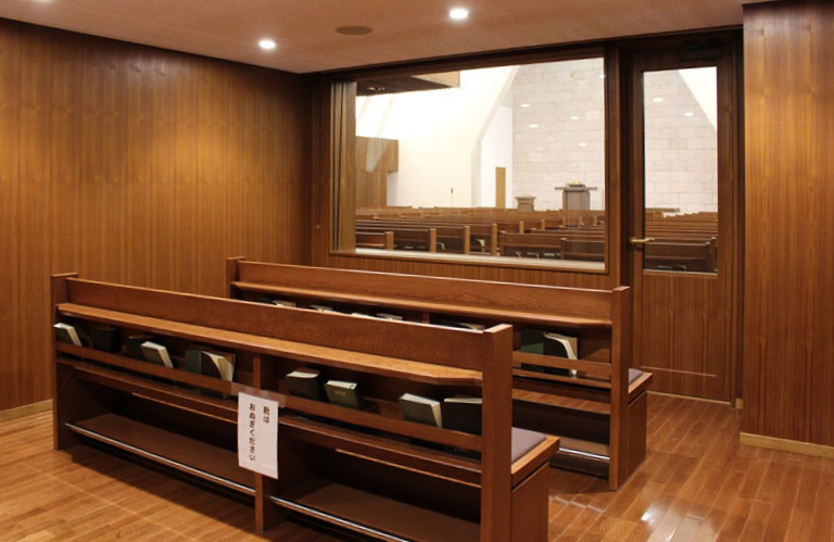 教会の礼拝には、すべての世代の方々が招かれています。幼いお子さまをお連れの方も、どうぞ会衆席で共に礼拝をおささげください。会衆席の一番後ろに、専用の席があります。