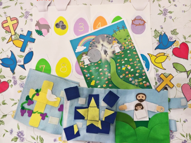 幼稚科では、絵本や紙芝居、塗り絵や工作、カード遊びや体を使った遊びを通して、聖書のお話に親しんでいます。